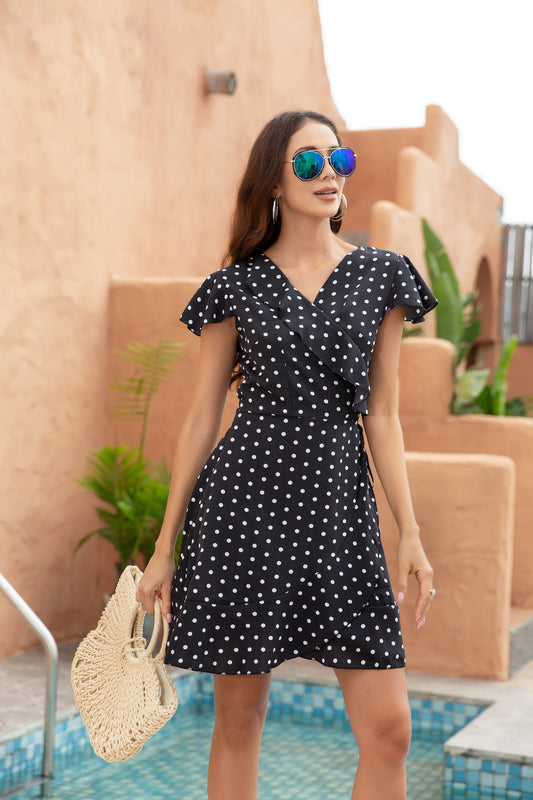 Women's Polka dot V neckline Short Sleeve Ruffle Midi Dress