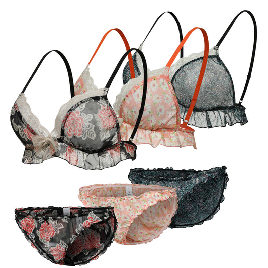 Chiffon Lace Plunge Bralette and Bikini Panty Lingerie Set